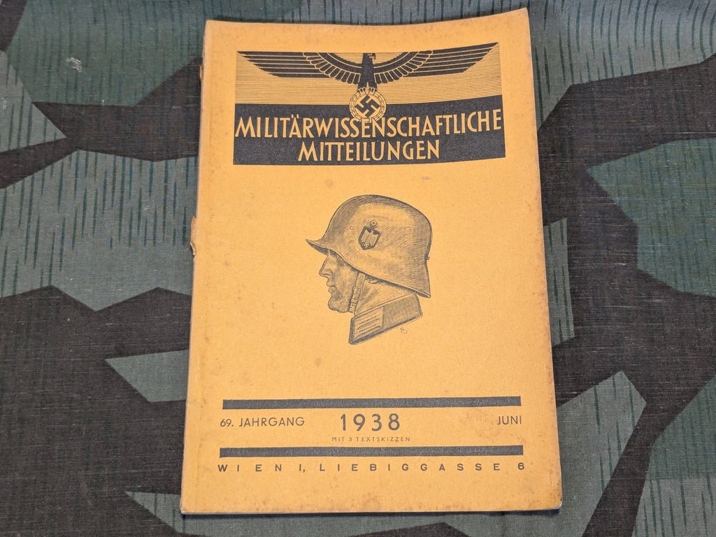 Militärwissenschaftliche Mitteilungen was a publication of military studies from Austria which was taken over after the Anschluss and continued through to 1944. It is intended to share and study lessons of war as well as digging into any topics related to the military. For example, this issue has an article about artificial fibers in military clothing. The ads are also interesting as they feel more targeted towards people that might be seeking to procure items for the army rather than advertising to individuals. At least that's the vibe I get from it. Basically I feel like if you were to see an officer in a waiting room or on a train somewhere this is what you would see them reading. It is in fairly good condition. There is a little damage on the spine but its not in any danger of falling apart.