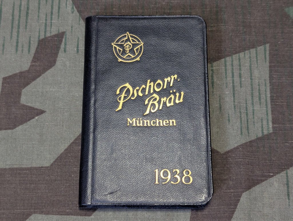 Original Pschorr-Bräu München pocket calendar / diary Merkbuch for 1938. It is in good condition and mostly unused. There are a few notes. This has a lot of drawings of all the National Socialist organization logos, flags of the NSDAP, ranks and insignia of all branches of the military, SS, SA, NSKK, police, etc as well as the usual street signs and generic information. This has an almost unusually high amount of NSDAP related things in it. An interesting bit of history from a fairly popular brewery. The brewery is still in business and is one of the more common beers you can get in the USA. I can't recall if the beer was really good or not, which makes me think it was probably just fine.