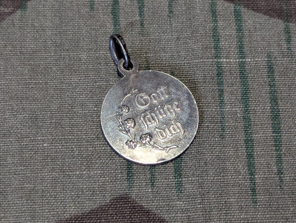 Vintage small charm with Gott schĂŒtze dich (God protect you) written on one side and St. Christopher on the other side. The loop is marked 925 and there's a very small maker's mark that I can't quite see. Good condition with light wear.