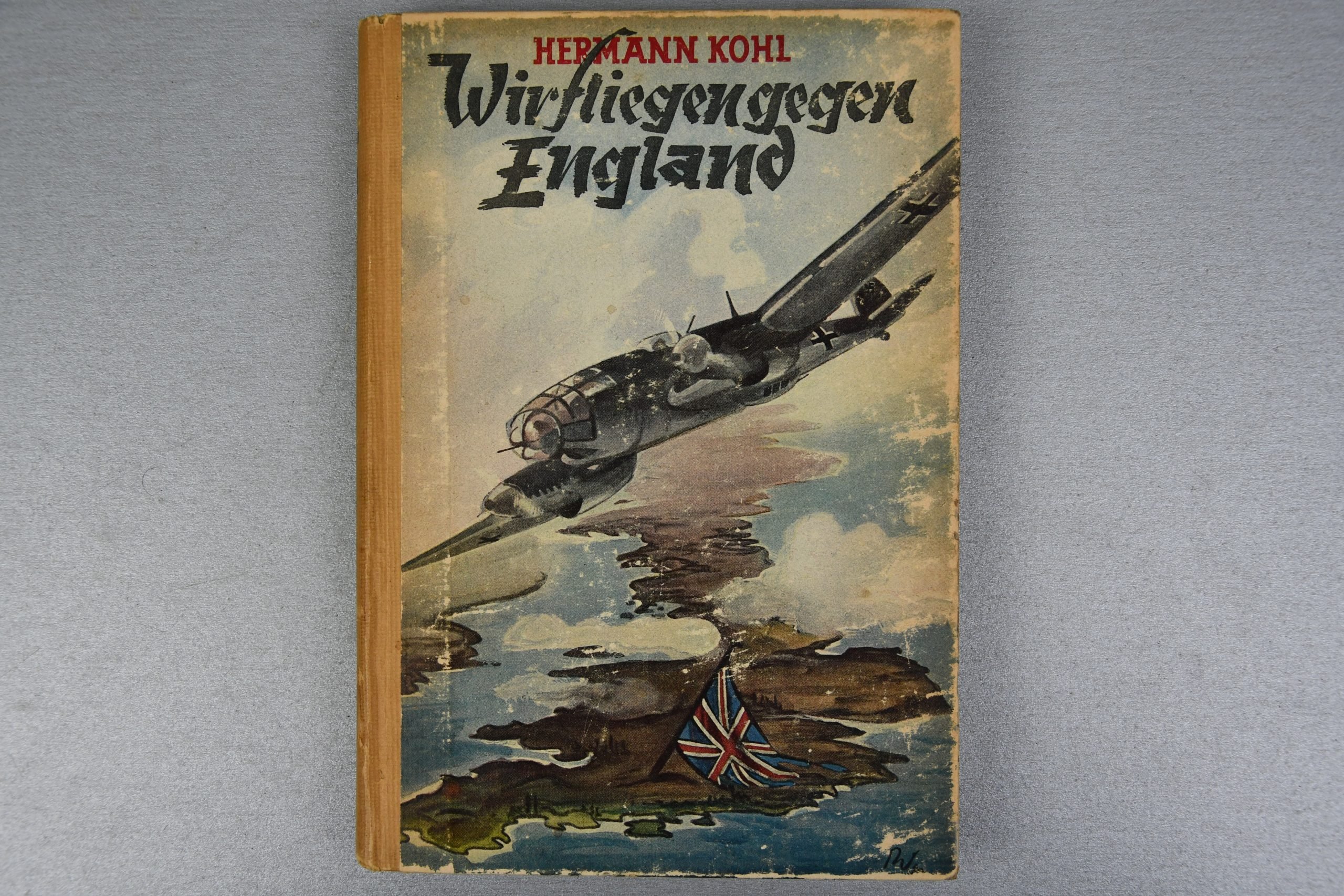 Original hardcover bookWir fliegen gegen England – Einsatz der Luftwaffe 1939/40by Hermann Kohl, published by Enßlin & Laiblin, Reutlingen. An illustrated volume covering the operations of the Luftwaffe during the early phase of the war. This copy is complete and firmly bound, showing visible age and handling wear to the cover and light paper toning. It contains an internal stamp from an NSDAP-AO library, adding historical interest. Collectible within WWII aviation literature.