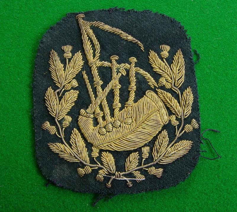 Scarce early large size gold bullion wire sleeve badge worn by a Pipe Major. A set of bagpipes within a wreath of thistle on a very dark green backing. {Approx 11.5 x 9cms.}