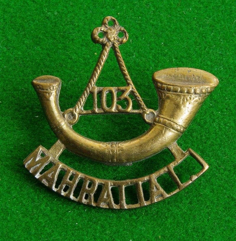 Brass shoulder title with two integral lugs to the reverse. A strung bugle horn with '103' between the strings above the title scroll, ' Mahratta L.I.'