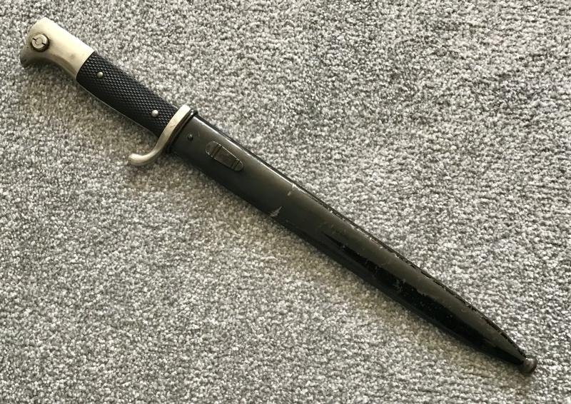 This unusual bayonet, originally issued to the Deutsches Reiches Post, is stamped D.R.P. to the reverse ricasso (partially obscured, possibly due to re-assignment).Crossguard, backstrap and pommel show few signs of age and no signs of misuse. Mortice button operates correctly and rifle slot has a red felt plug. Chequered black grips are correctly attached with domed headed rivets. Plated blade is in excellent condition having only minor in and out marks close to the tip. Scabbard has no dents or other damage and retains the vast majority of its black finish.