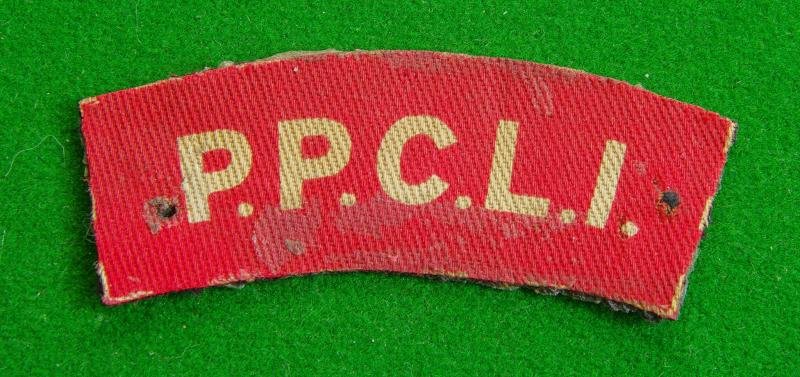 Scarce WW II printed in white on red shoulder title, ' P.P.C.L.I.' {Pin holes each side of the title and old tape to the reverse,priced accordingly}