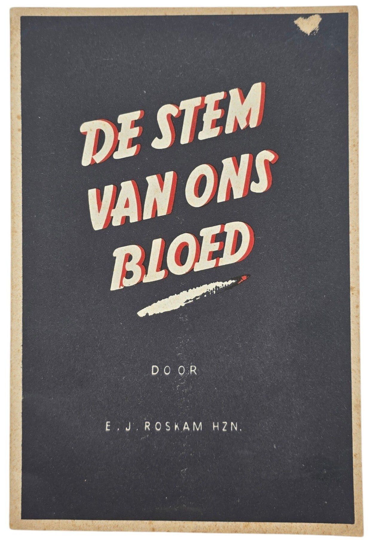 Original WW2 Dutch Collaboration NSB Brochure -De stem van ons bloed, E. J. Roskam (1940)The cover has some damage. Ex libris stamp in the front.Originele Wo2 Nederlandse Collaboratie NSB Brochure -De stem van ons bloed, E. J. Roskam (1940)Dit exemplaar heeft wat schade aan de kaft. Ex libris stempel binnenin (De Vertrouwensman PTT District VIII te Purmerend''.