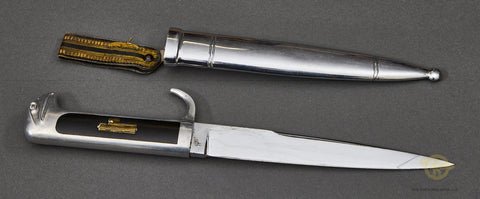Italian Fascist Model 1932 Dagger-A beautiful example of the 1932 model. It measures approx. 12' in length, with a hilt made out of polished aluminum with an eagle head pommel. The black enameled grip plates have the gold Fascist bundle on the obverse. You can see the bolt on the reverse that holds the bundle to the grip. The silvered steel scabbard retains 95% of its original finish. This shows only light use, no real damage. The blade is very good overall. This comes with a small gold and black hanger that has been with this piece forever. A cool little knife.Online checkout is not supported for edged weapons. Please note that some items are listed as 'SOLD OUT' for this reason. All edged weapons listed on the website are available for purchase. Please contact us for any questions, or to purchase thanks!