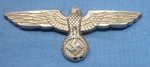 Original period manufacture. Aluminum cap eagle with two mounting prongs on the reverse. Interesting soldier modification, with two tiny holes drilled into the bottom edge of the wreath. Allowed the wearer to sew down the wreath to the body of the hat.
