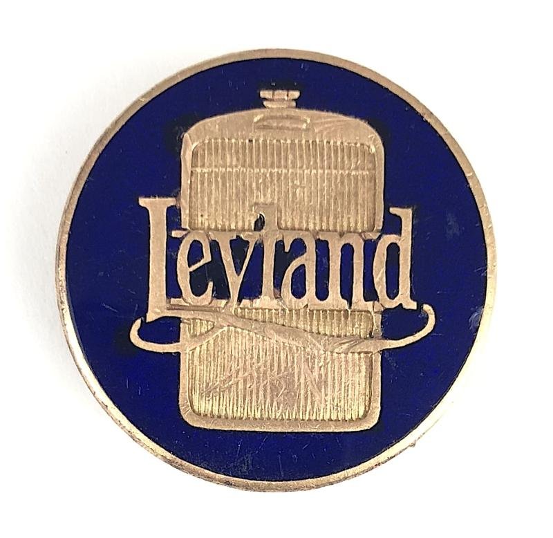 A very rare original early Second World War circa 1939 period 'Leyland Motors Limited war worker on war service identification badge'; circular example depicting a gilt brass recessed commercial radiator grill inscribed across the centre with the companies trademark logo and inlaid with Electric blue enamel; the reverse impressed with early maker's details 'FATTORINI & SONS LTD BRADFORD WORKS BIRMINGHAM' an address format used between 1933 and 1939 and impressed with official issue number '10687'. Very good condition, complete with original buttonhole lapel fitting, no emamel loss, minor surface scratches.Diameter approx 26mm.Leyland Motors Limited, Lancashire were vehicle manufacturer of lorries, buses and trolleybuses, during the Second World War along with most vehicle manufacturers they were involved in war production. Leyland built the Cromwell tank at its works from 1943 as well as trucks such as the Hippo and Retriever.