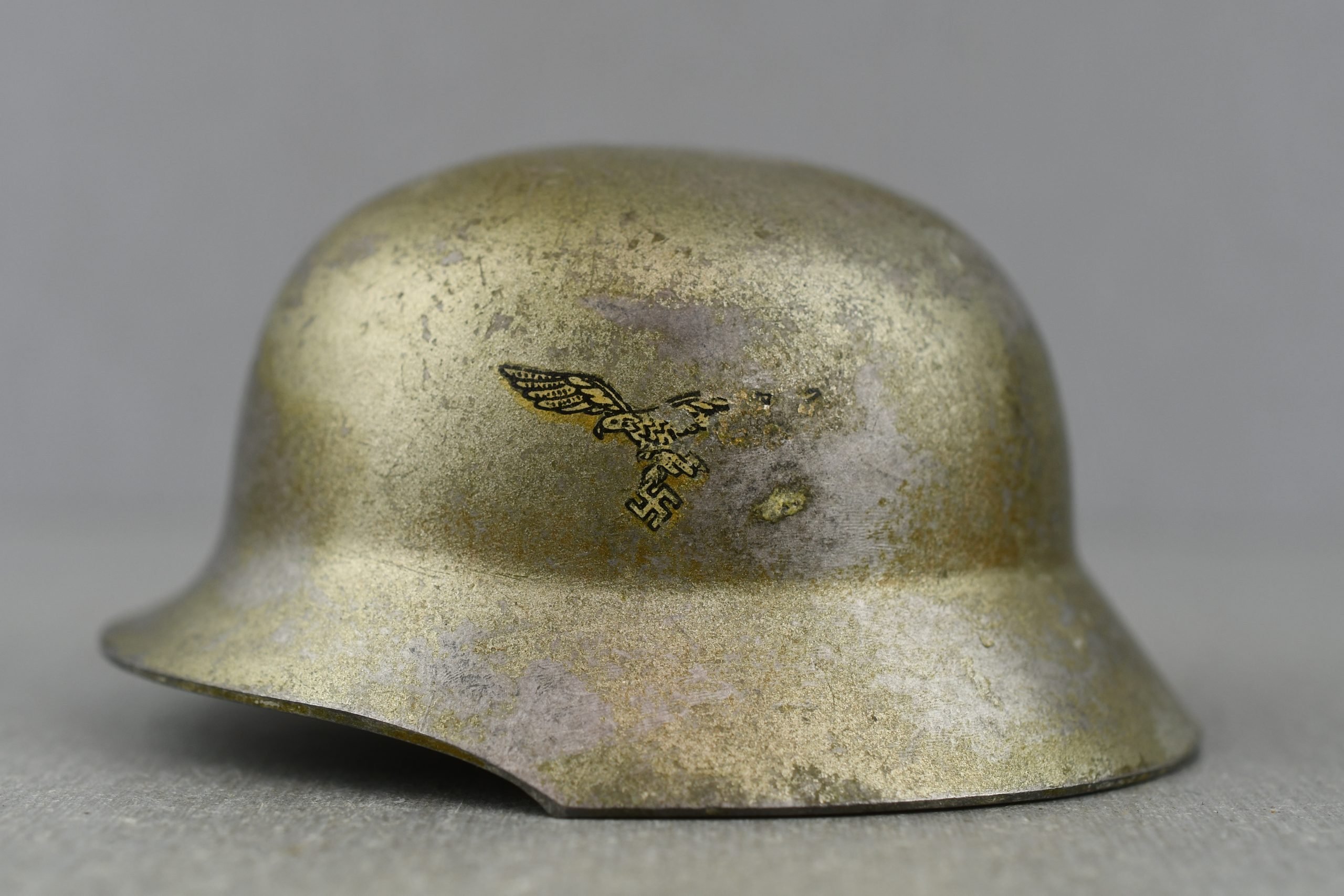Genuine WW2 German wedding helmet. Rare Luftwafffe example with double decals. These were used to substitute the soldier being present at his own wedding. The bride would place her hand on the miniature helmet and take the marriage vows in his absence. As so many young men were at the front fighting and couldn't get leave, this was a way the government recognized the vows as official.