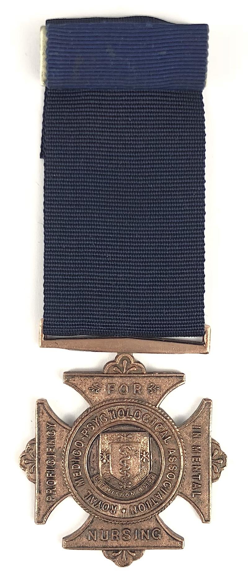 A good original post 1926 early issue 'Royal Medico-Psychological Association For Proficiency In Mental Nursing' bronzed medal, the reverse inscribed 'N. STUBLEY'. Very good condition, complete with dark blue replacement silk ribbon with original ribbon bar.Height of badge approx 49mm.