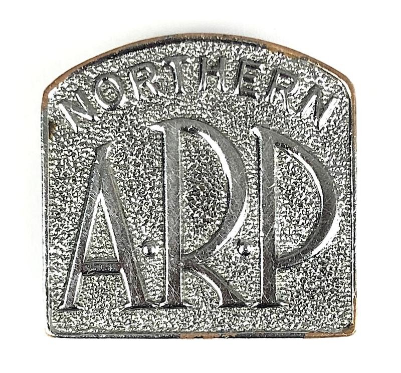 A scarce original Second World War period 'Air Raid Precaution 'Northern ARP' home front warden badge'; large chromium plated arch top square bearing distinct A.R.P lettering on stippled ground. Very good condition, complete with original buttonhole lapel fitting.Height approx 26mm.