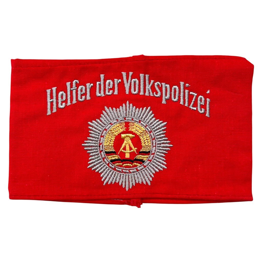 Original DDR armband 'Helfer der Volkspolizei' from the Cold War period, worn by civilian auxiliaries of the East German Volkspolizei.This red cotton armband features embroidered silver-colored lettering and, centrally, the state emblem of the GDR within a starburst wreath, executed in multicolored embroidery.The armband was worn by the so-called Freiwillige Helfer der Volkspolizei, civilians who assisted the police with supervision and maintaining public order. The striking red background ensured immediate visibility in public.A historically interesting collector's item for collectors of DDR, Volkspolizei, and Cold War militaria, as well as for enthusiasts of East German uniform pieces and political history.Article number: 18452Originele Koude Oorlog periode DDR Duitse 'Helfer der Volkspolizei' armbandOriginele DDR armband 'Helfer der Volkspolizei' uit de Koude Oorlog-periode, gedragen door burgerhelpers van de Oost-Duitse Volkspolizei.Deze rood katoenen armband is voorzien van geborduurde zilverkleurige tekst en centraal het staatswapen van de DDR in een stervormige krans, uitgevoerd in meerkleurig borduurwerk.De armband werd gedragen door zogenoemde Freiwillige Helfer der Volkspolizei, burgers die de politie ondersteunden bij toezicht en ordehandhaving.Het opvallende rode veld zorgde voor directe herkenbaarheid in het straatbeeld.Een historisch interessant verzamelobject voor verzamelaars van DDR-, Volkspolizei- en Koude Oorlog-militaria, evenals voor liefhebbers van Oost-Duitse uniformstukken en politieke geschiedenis.