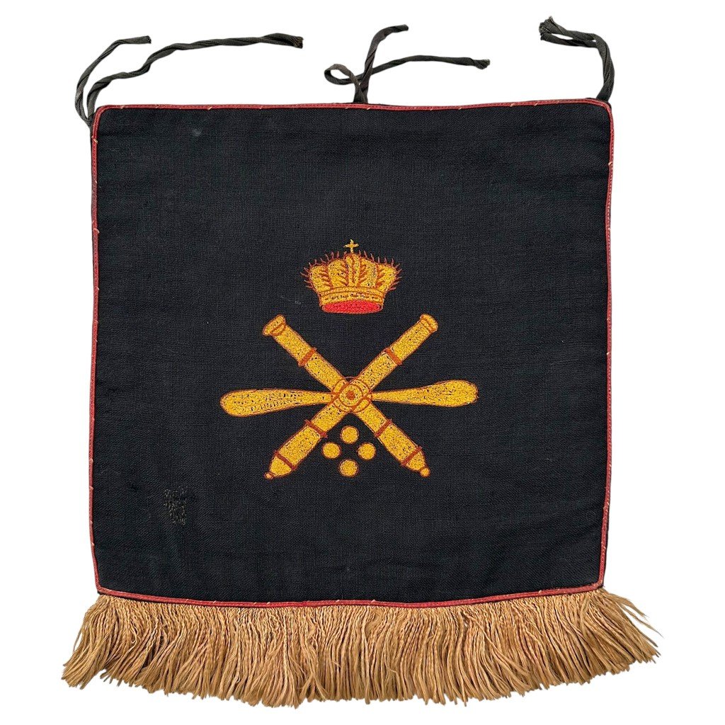 Original Dutch Army trumpet banner of the Anti-Aircraft Artillery (Luchtdoelartillerie) from the pre-1940 period, a finely executed ceremonial piece dating to the mobilization years of the Netherlands Army. Such banners were attached to military trumpets or signal horns and used during parades, drills and ceremonial occasions within artillery units.The banner is made of dark fabric and features a richly embroidered emblem in gold/yellow colored thread. The edges are finished with red piping and the lower edge is decorated with a fringe.At the top the original attachment ribbons are still present, which were used to secure the banner to the trumpet.Trumpet banners of the Dutch Anti-Aircraft Artillery from the mobilization period before the Second World War appear relatively rarely on the market. It is therefore an interesting historical military collectible for collectors of pre-1940 Dutch Army equipment, artillery memorabilia and ceremonial military items.Dimensions: 33 × 29 cm.Article number: 18453Originele Pre 1940 Nederlands leger Luchtdoelartillerie trompet vaandel