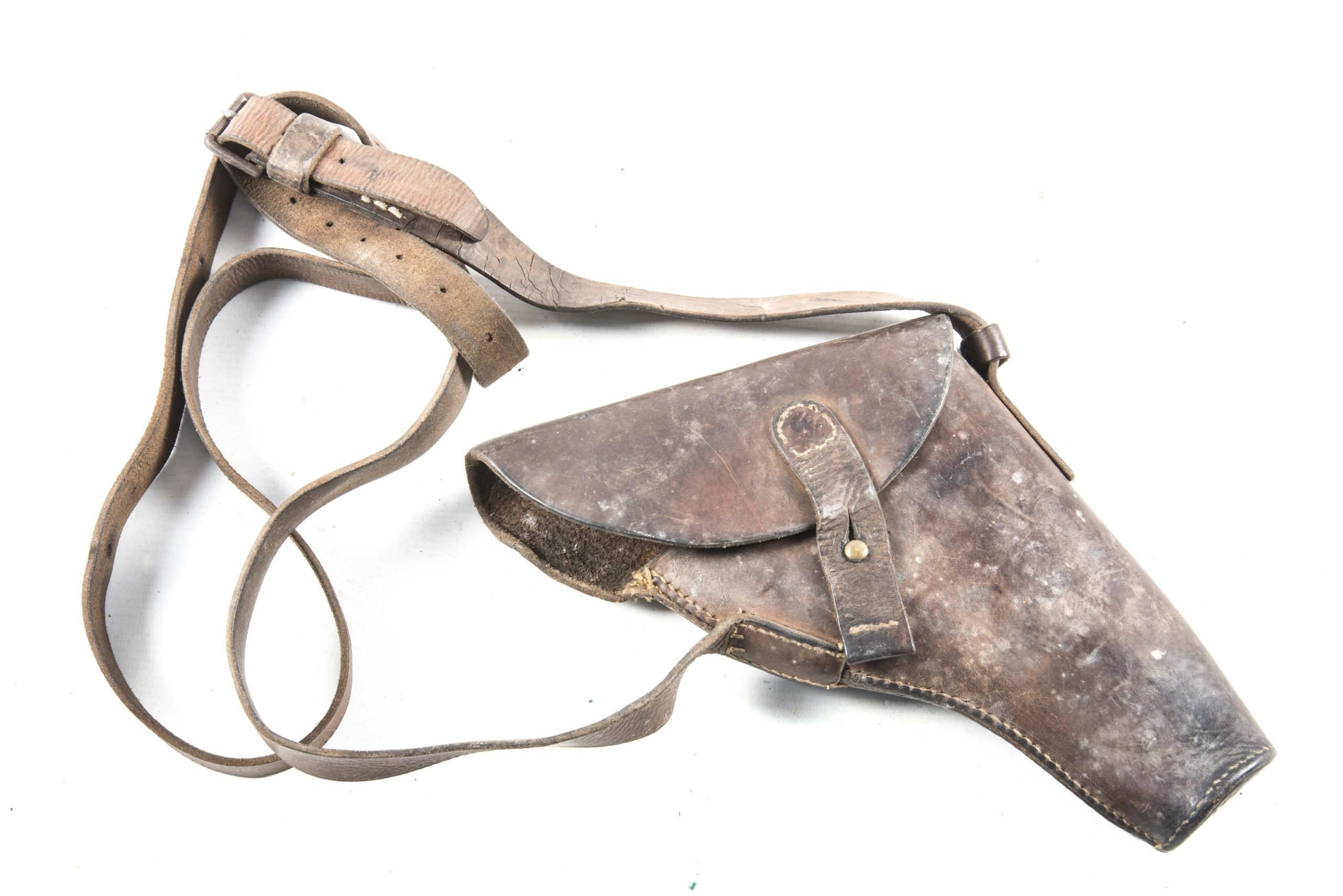 British flare holster with carrying strap in good used condition. It is marked Jeffries & Sons 1941 and has a period attatched metal plate reading 3 PTON Pistol L86529.