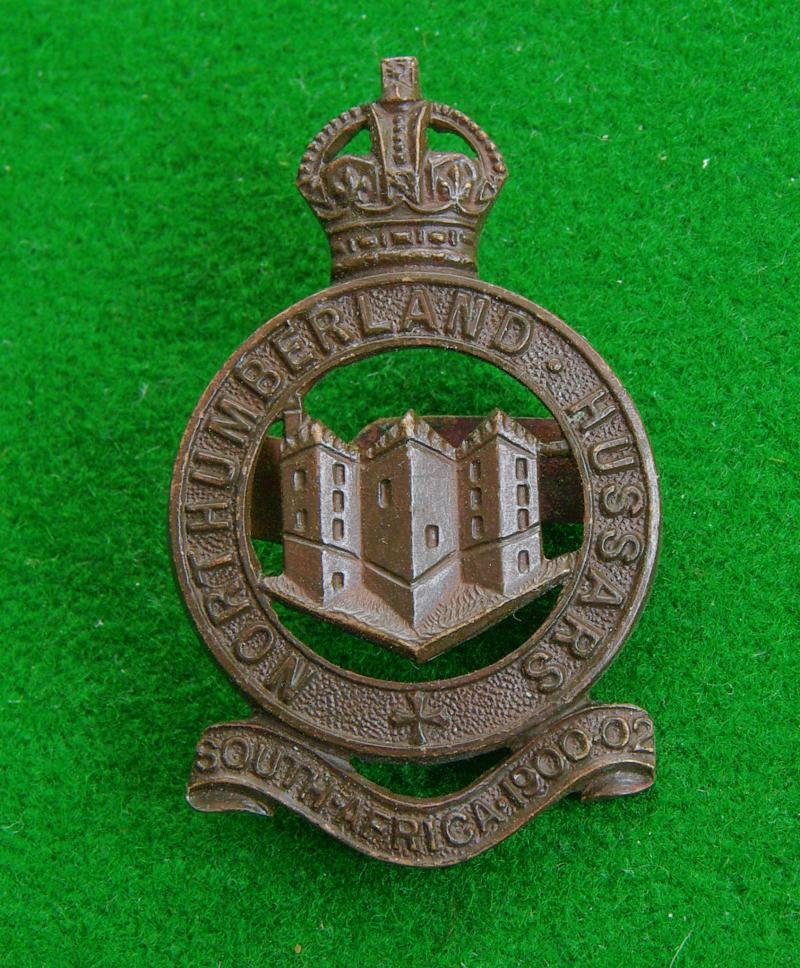 Scarce king's crown officers bronze service dress cap badge with two blades to the reverse. Alnwick Castle to the centre of a crowned circlet bearing the title above the furled South Africa honour scroll.