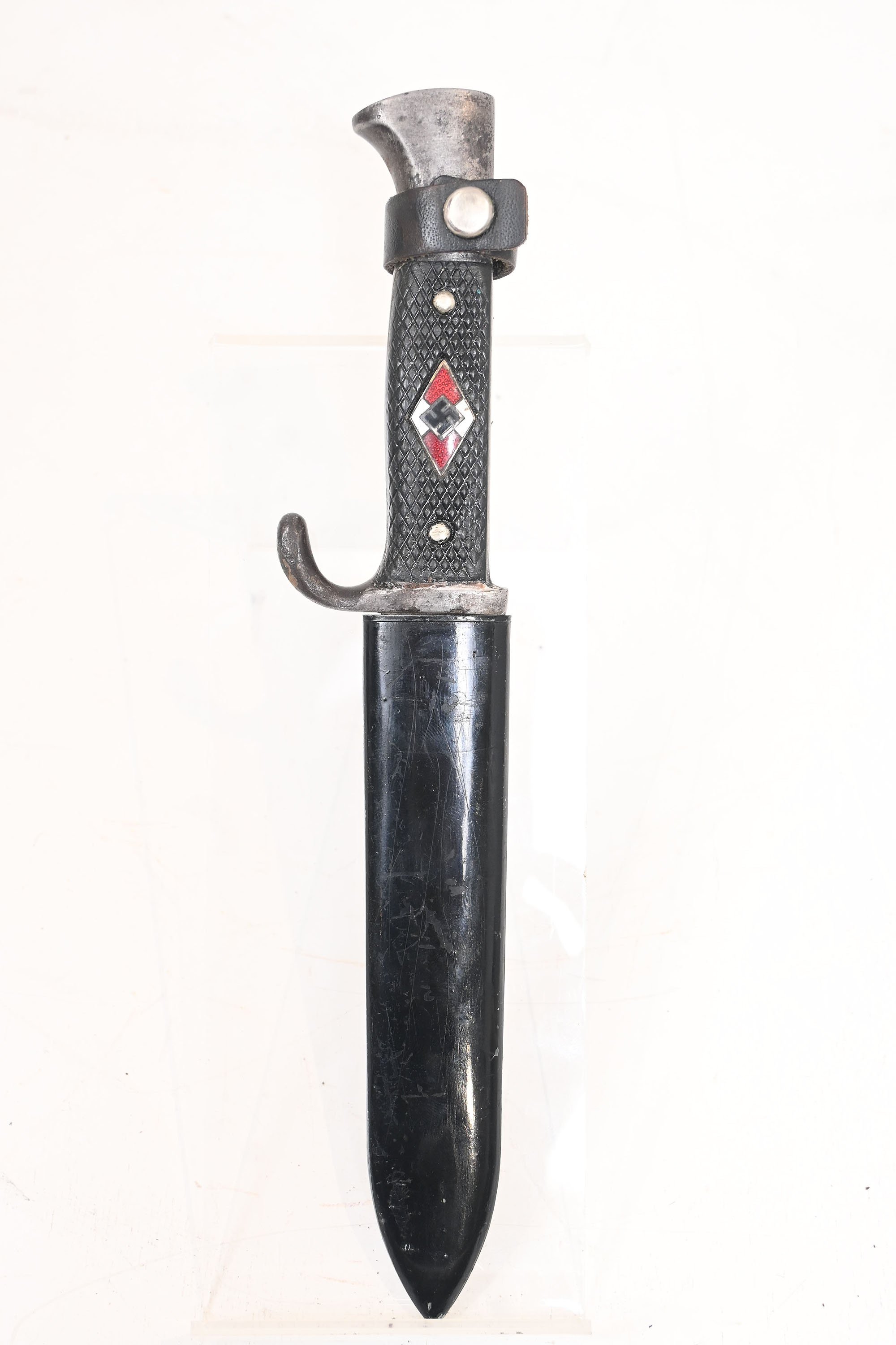 Well used hitlerjugend dagger with the text blut und ehre on the front.The back of the blade is marked 'RZM M7/2 1937', indicating manufacture by the Emil Voos company in 1937.the blade has been sharpened at some point.