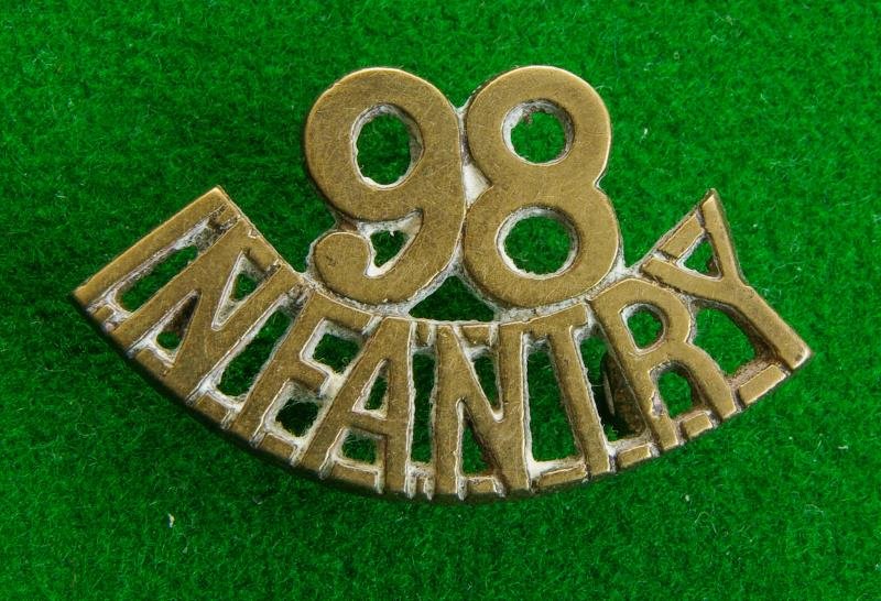 Brass shoulder title, ' 98 / Infantry' with three integral lugs to the reverse.