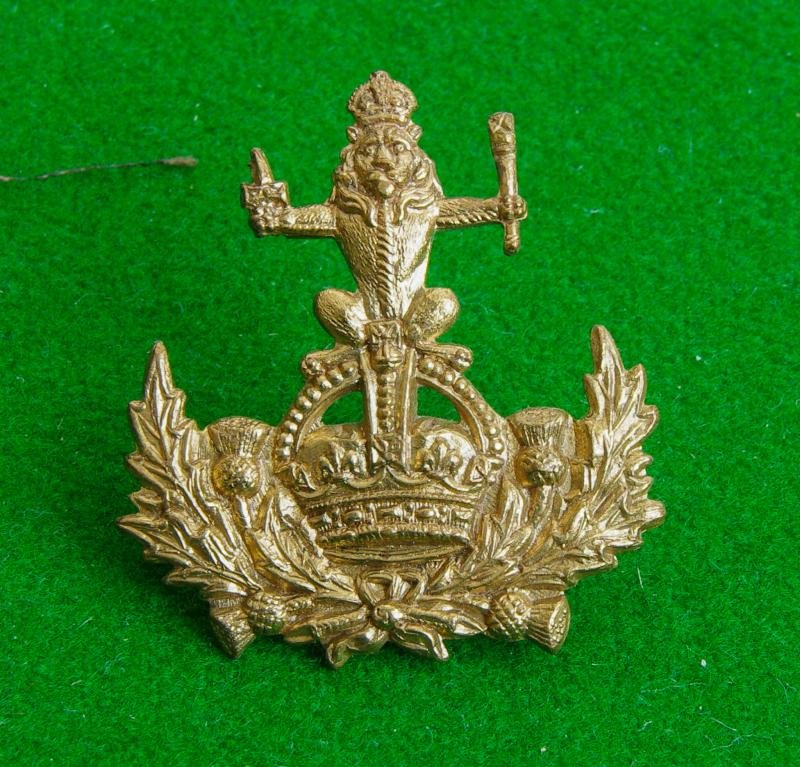 Brass king's crown cap badge with two loops to the reverse. The Royal Crest of Scotland within a wreath of thistle. {This is the small thistle wreath pattern}