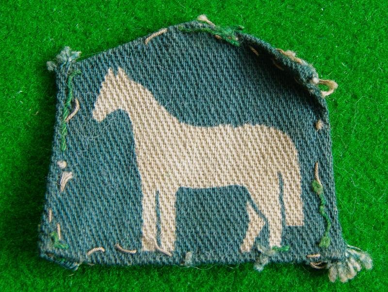 WW II printed example of the standing white horse on a dark green domed shape backing. 9th. Armoured fought in North Africa with the Eighth Army and was composed of Cavalry {3rd.Hussras} and Yeomanry {Wiltshire and Warwickshire} units.