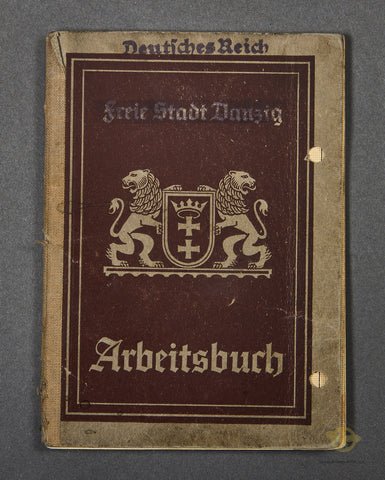Freie Stadt Danzig Arbeitsbuch-This is a workers book for a citizen of the free state of Danzig. It has a 'Deutsches Reich' ink stamp on top of the front cover. His name was Franz Floszignski and he was born 13.1.1902. This book has a number of entries from 1930 through 1941. The cover has separated from the book itself but otherwise good condition!