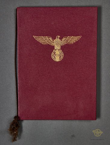 Handsome Sport Festival Award for Pistol Shooting-This is a hardbound red bifold award with a fantastic gold HJ like eagle on the cover. The first page says 'Sports Festival of the City of Perg' (located in the state of Upper Austria, Austria). Inside its says that this was awarded to Jgg. Grabner Johann, Mauthausen for proficiency in pistol shooting. He earned 2ndplace with a score of 97 rings. This was held on June 14, 1942 in Perg. It is hand signed by the leader at the bottom. The cassette measures 6' by 8 ½' and it is in excellent condition overall. A one of a kind item!