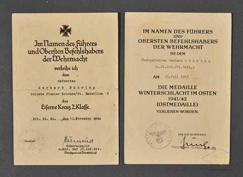 Pair of Award Documents to Same Soldier-Both of these were issued to Gerhard Bühring. One is for the the EKII, dated 13 November 1940 as a Gefreiten in a pioneer battalion. The second one is for the Russian Front medal as an Obergefreiten in the same unit. This is dated 15 Juli 1942. Each is hand signed and stamped. Each has minor wear, staining and creasing and measures 8 ½' by 8'. A nice grouping!