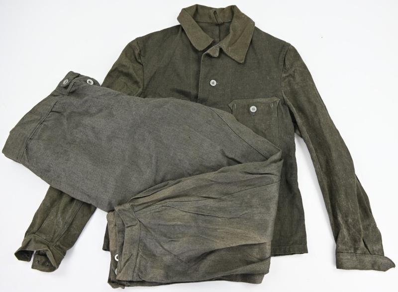In a very good, never used condition a very hard to find German Kriegsmarine U-Boat Crew Members workers tunic and pants.Both are nicely made of the Drillich cloth and comes with the makers stamp of the company of C. Badekow from Hamburg and has also the production date of 1943 marked.Both comes also with the marking of the Kriegsmarine Bekleidungsdepot Brest (France).A very stunning and not easy to find U-Boat Crew member set in a good mannequin size!