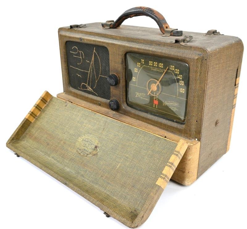 In a very good condition a stunning US WW2 period Long distance radio made by Zenith Radio Corp., Chicago. Zenith Wavemagnet model No. 6B03.This radio includes a built in carrying case with locks and is in a very good condition as found after the war.The radio is complete and nicely named on the inside to 15th US Army Air Force Pilot and 1st lieutenant 1st William H. Snee from Navarre Ohio.A very stuning item for display!