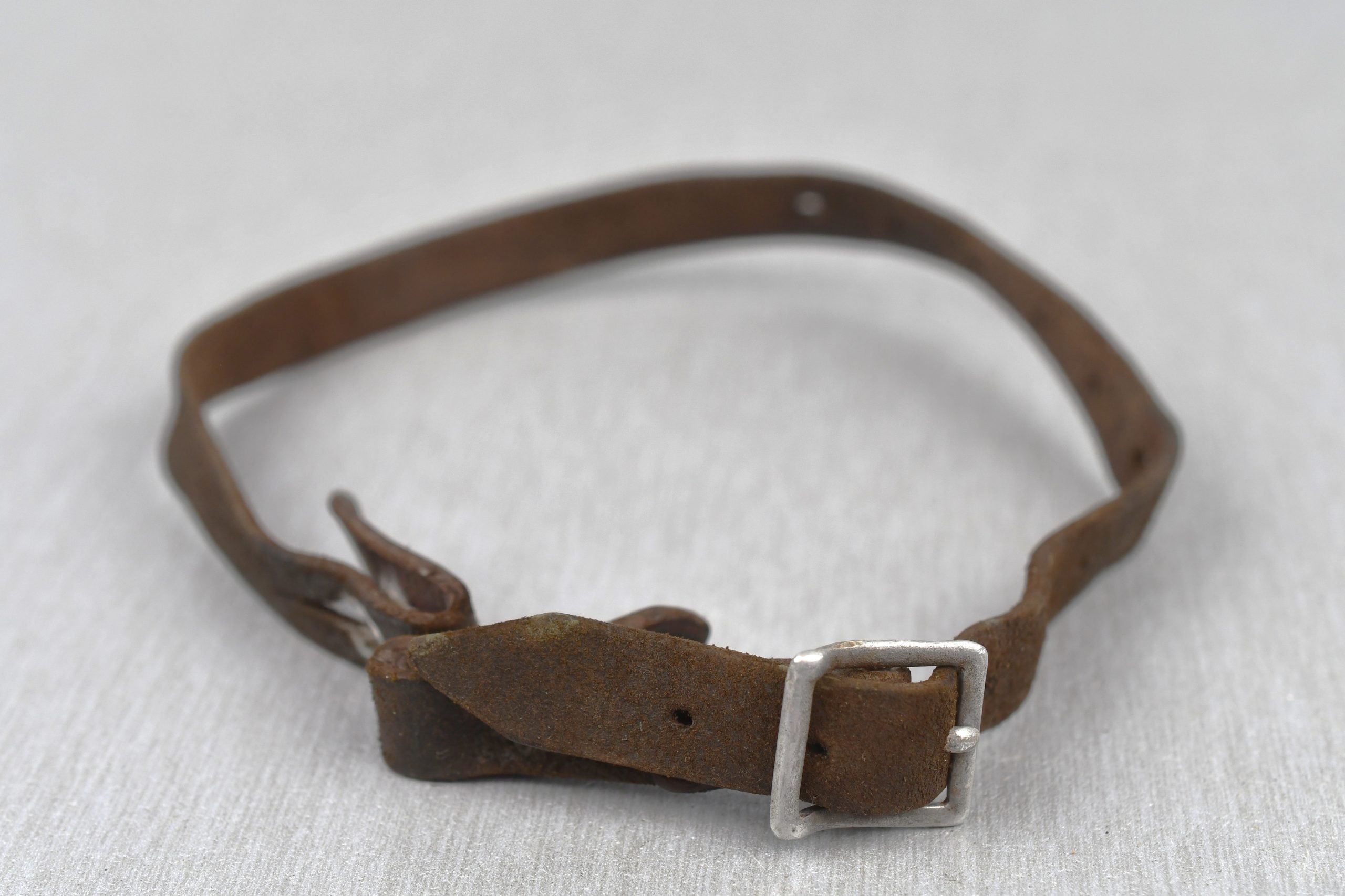 Worn leather helmet strap. Maker marked by Fr. Offermann & Söhne, Bensberg. Early ca.1939 construction, still has pre-war aluminum buckle Leather is supple and strong.