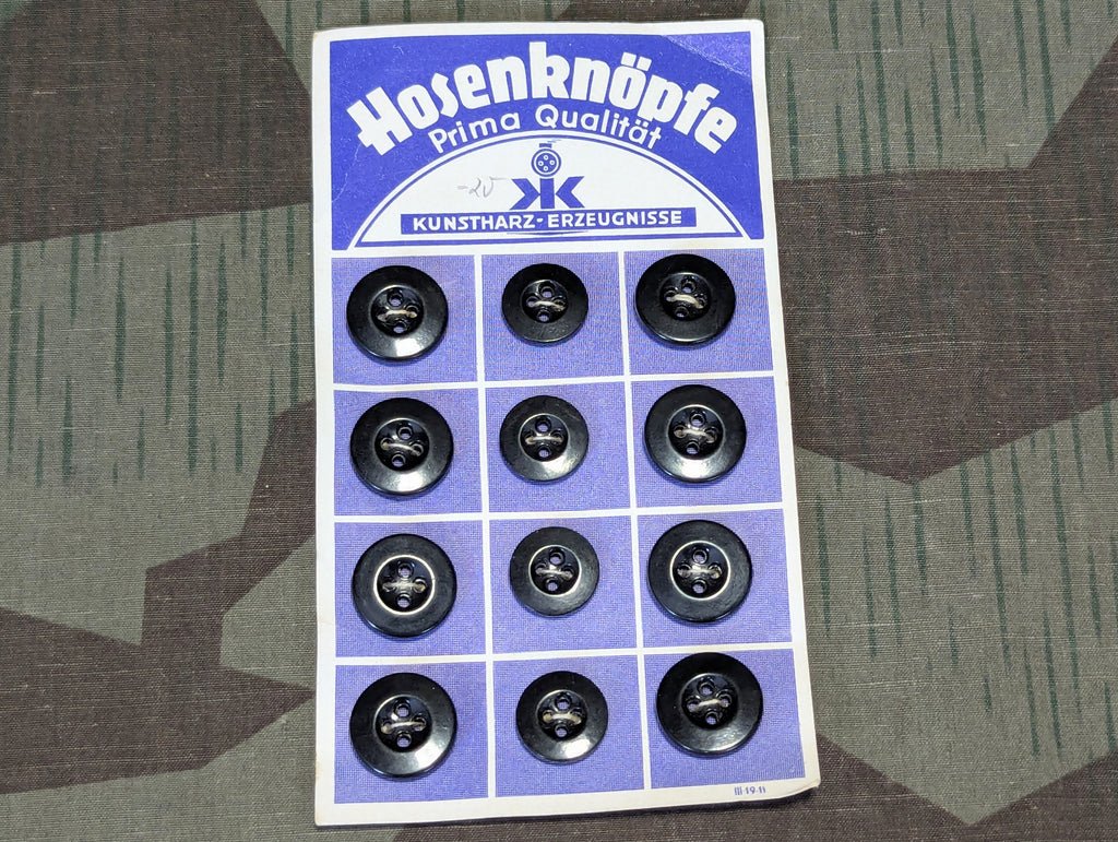 Original full card of 12 replacement black trouser buttons. The card has 8 × 17mm buttons and 4 × 15mm buttons. Original deadstock. In good condition but may have some minor age related wear or dirt.