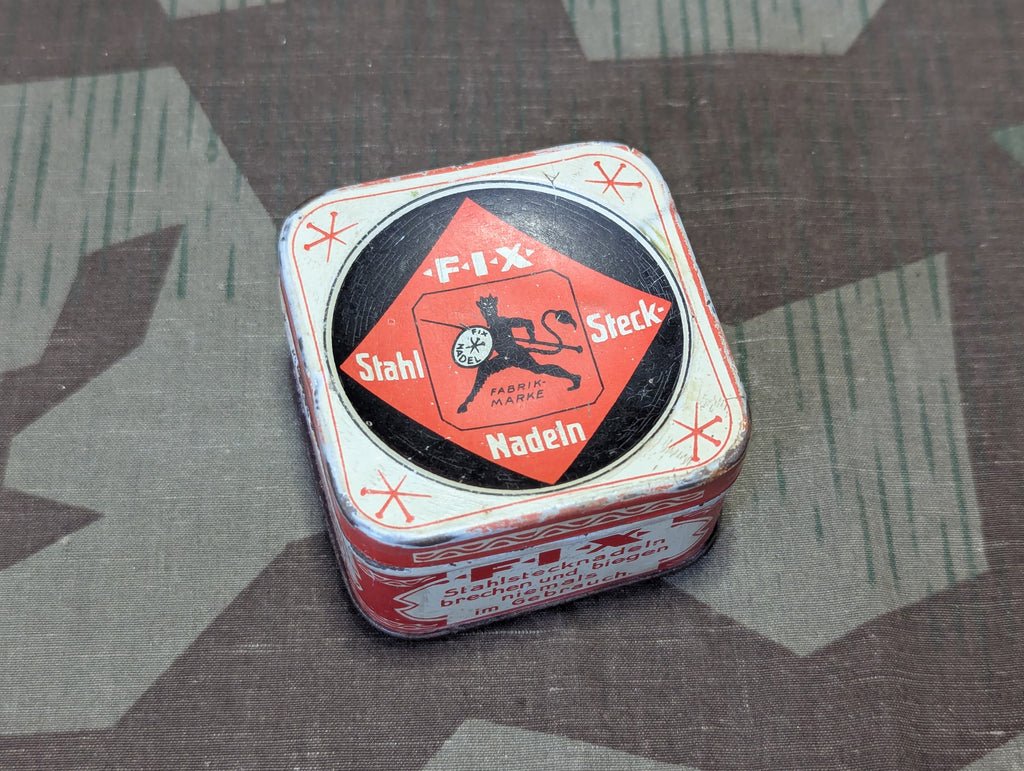 Nice original tin for FIX Stahlstecknadeln sewing pins with a little devil graphic. I imagine they chose a devil due to the numerous pokes you probably would get every time you stuck your fingers in to fish out a pin. The top of the tin is dished which I believe serves as a little tray for loose pins. It is in pretty good condition with some wear, mostly on the inside.