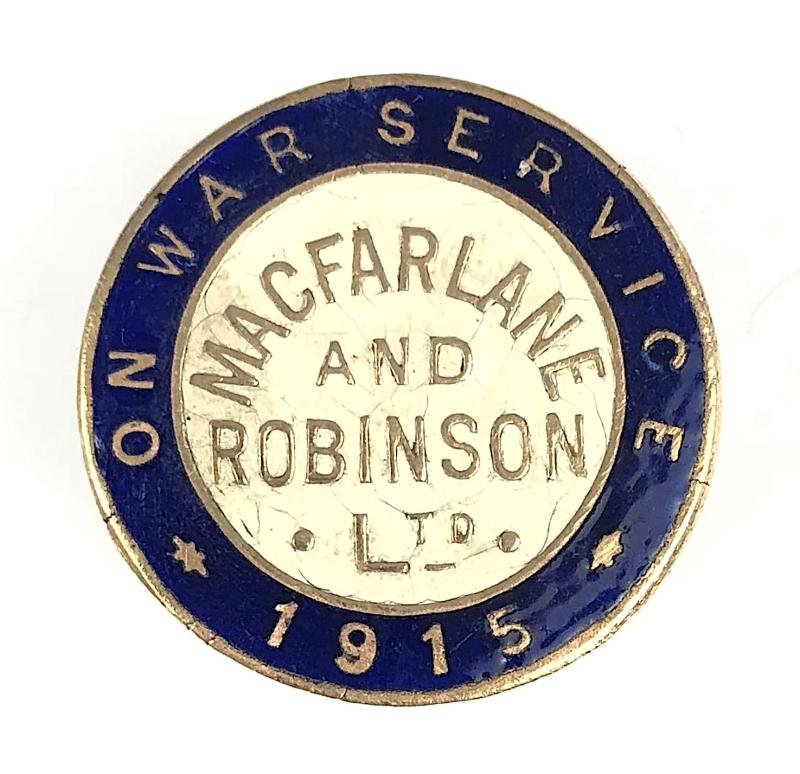 A scarce original First World War period 'Macfarlane And Robinson Ltd On War Service 1915 identification badge', gilt brass blue enamel title surround, companies name to centre on white enamel ground. Good condition, complete with original buttonhole fitting, no enamel loss, minor crazing to white enamel, gilt finish remains bright.Diameter approx 25mm.1915 Macfarlane & Robinson Ltd were manufacturers of enamelled stamped steel and had Warehouses in Wolverhampton, Roxburgh, Scotstoun Glasgow and 76 Southwark St. London.
