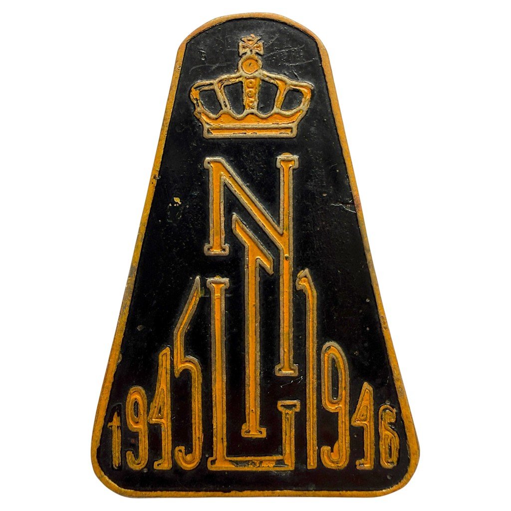 This original Dutch East Indies 'Voortrekkers' metal badge dates from the period 1945–1946 during the turbulent years following the Second World War in the Dutch East Indies.The badge features a stylized monogram crowned with the Dutch royal crown.At the bottom the years 1945 and 1946 are displayed referring to the early post-war period in the Dutch East Indies.Such badges were worn as identification insignia by individuals involved in the early Dutch presence and organization in the region after the war.The piece is made of metal with a dark enameled background and gilt colored details.On the reverse a fastening construction is present allowing the badge to be worn on a uniform or clothing.The reverse is also marked 'Cordesius & Zonen Batavia', a well known manufacturer of insignia in the Dutch East Indies.The badge shows signs of wear and patina consistent with its age and historical use.Article number: 18504