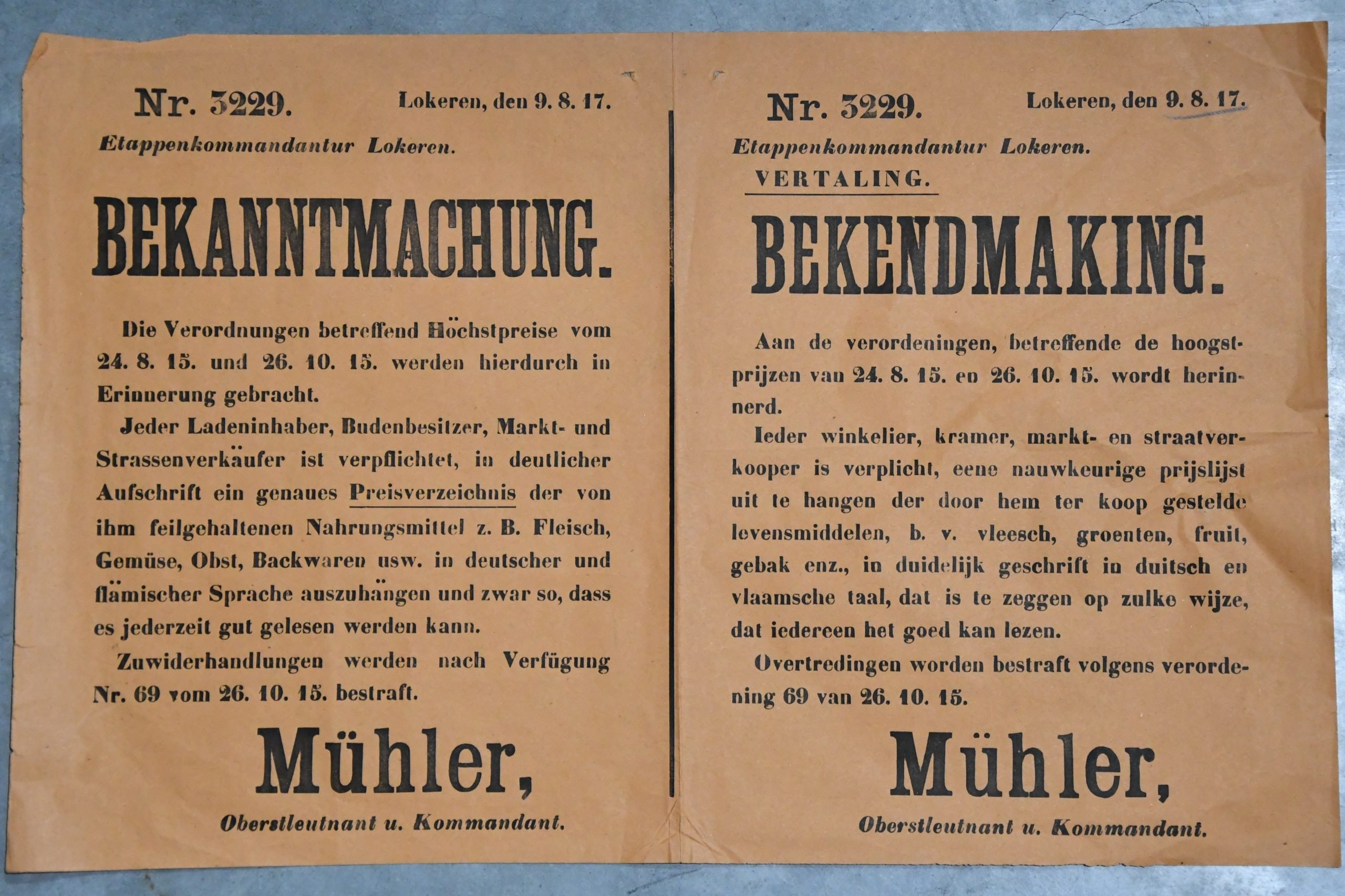 An original First World War German occupation poster issued by the Etappenkommandantur in Lokeren on 9 August 1917. The proclamation appears in both German and Dutch, reflecting the administrative practice of the German military authorities in occupied Belgium to publish official regulations in both languages for the local population.The notice concerns the regulations regarding maximum prices for foodstuffs, originally established by decrees dated 24 August 1915 and 26 October 1915. These regulations are here formally reiterated and brought again to the attention of the public. During the war years, strict price controls were imposed to prevent speculation, profiteering, and uncontrolled price increases in essential goods.According to the order, all shopkeepers, stall holders, market traders and street vendors were required to clearly display a detailed price list for the food products they offered for sale. Examples listed include meat, vegetables, fruit, baked goods and similar food items. The price list had to be written in both German and Flemish and displayed in such a way that it could easily be read by customers at all times.The proclamation further warns that violations of these regulations would be punished in accordance with Decree No. 69 of 26 October 1915, highlighting the strict enforcement of economic controls during the occupation.The notice was issued under the authority of Oberstleutnant MΓΌhler, acting as Etappenkommandant of Lokeren. Such posters were publicly displayed throughout towns and villages to ensure compliance with German administrative regulations.Measuring approximately 36 Γ 55 cm, the poster shows typical signs of age including fold lines, light staining and minor wear consistent with original wartime paper notices.A historically interesting example of economic regulation and civilian administration under the German occupation of Belgium during World War I, making it an appealing item for collectors of WWI occupation material, German military administration documents, and early historical posters.