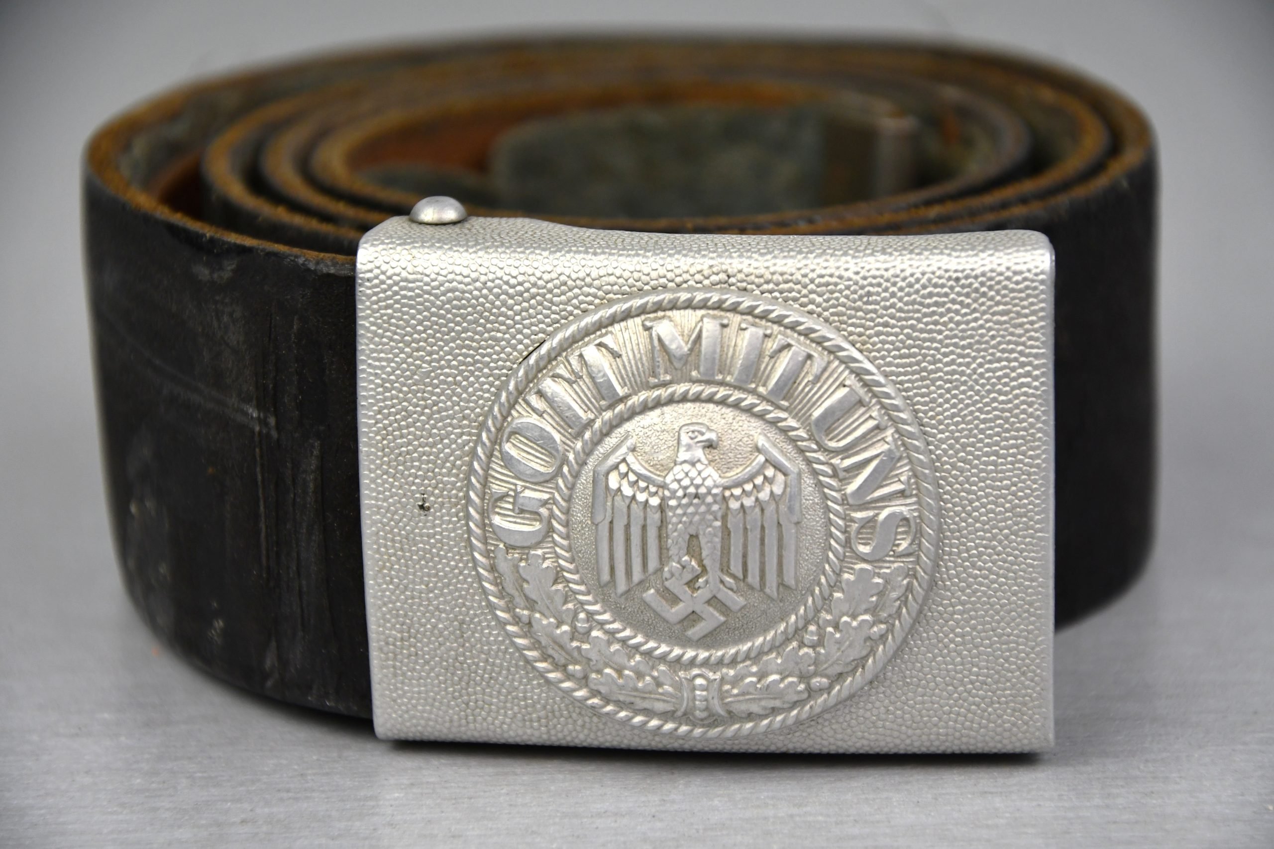 Original ligth weight parade buckle in very good condition. Comes with a lacquered dress belt – leather is stiff. Marked EIOS Militär-Ekkekten Extra Groupon. Size marked 96cm.