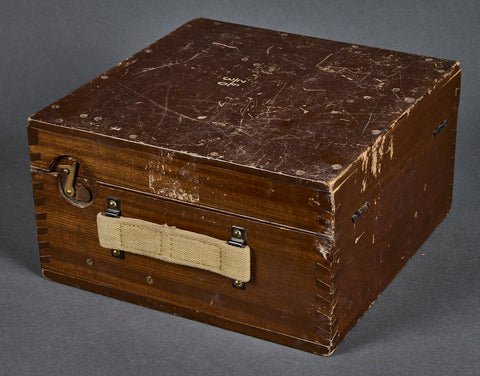 Veteran Bring Back Japanese Type 96 Sextant-This is a very nice WWII Japanese Navy Type 96 Naval Sextant, known in Japanese as the九六式六分儀改一(Kyū-Roku-shiki Rokubungi Kai-Ichi or 9 6 Type Sextant Revision 1), which is marked on the side of the wooden case's metal data plate. The date plate also gives serial number 2179, as well as an issue date of Showa 18 (1943) 11th Month (November). This was made or distributed by the Tamaya Shoten Co. Interesting that Tamaya Shoten was one of the first Japanese companies to import surveying equipment from overseas and to distribute them in Japan. Sextants were used on ships for celestial navigation, as well as other angular sighting needs. They were a tried and true method of navigation that had been used for centuries. By WWII Sextants were quite modern in design, with attached handles, lights, sun filters, and other accessories. However, the basic design remained unchanged. The sextant is in excellent condition and appears to be fully operational with clear optics, multiple colored filters and functional adjustments. It has an integral bakelite battery compartment / handle that also can plug into the electrical system of the ship with the included cord. It has a standard sighting telescope with two different sliding eyepieces, as well as a longer range prism sight, both of which mount into a dovetail on the sextant. This is really a high quality piece of workmanship. The wooden transit case measures 11 ¾ inches square, and 6 ½ inches tall. It is in very good condition, though there is scuffing throughout. A great piece of Navigational Equipment that would look excellent in your display! Be aware that the top is a bit tough to open.