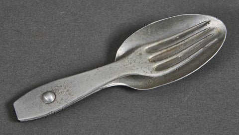 German WWII Wehrmacht Mess Kit-This is the iconic spoon and fork utensil kit found in many mess kits. It is made of aluminum and shows wear. This is nicely marked with a Heer eagle on the handle of the fork, as well as on the reverse of the spoon. The reverse of the spoon also has the maker mark for ESM. This is the mark for the manufacturer E. Schäfer & Söhne, a known maker of aluminum and steel canteen and cutlery equipment for the German military.. In good shape overall
