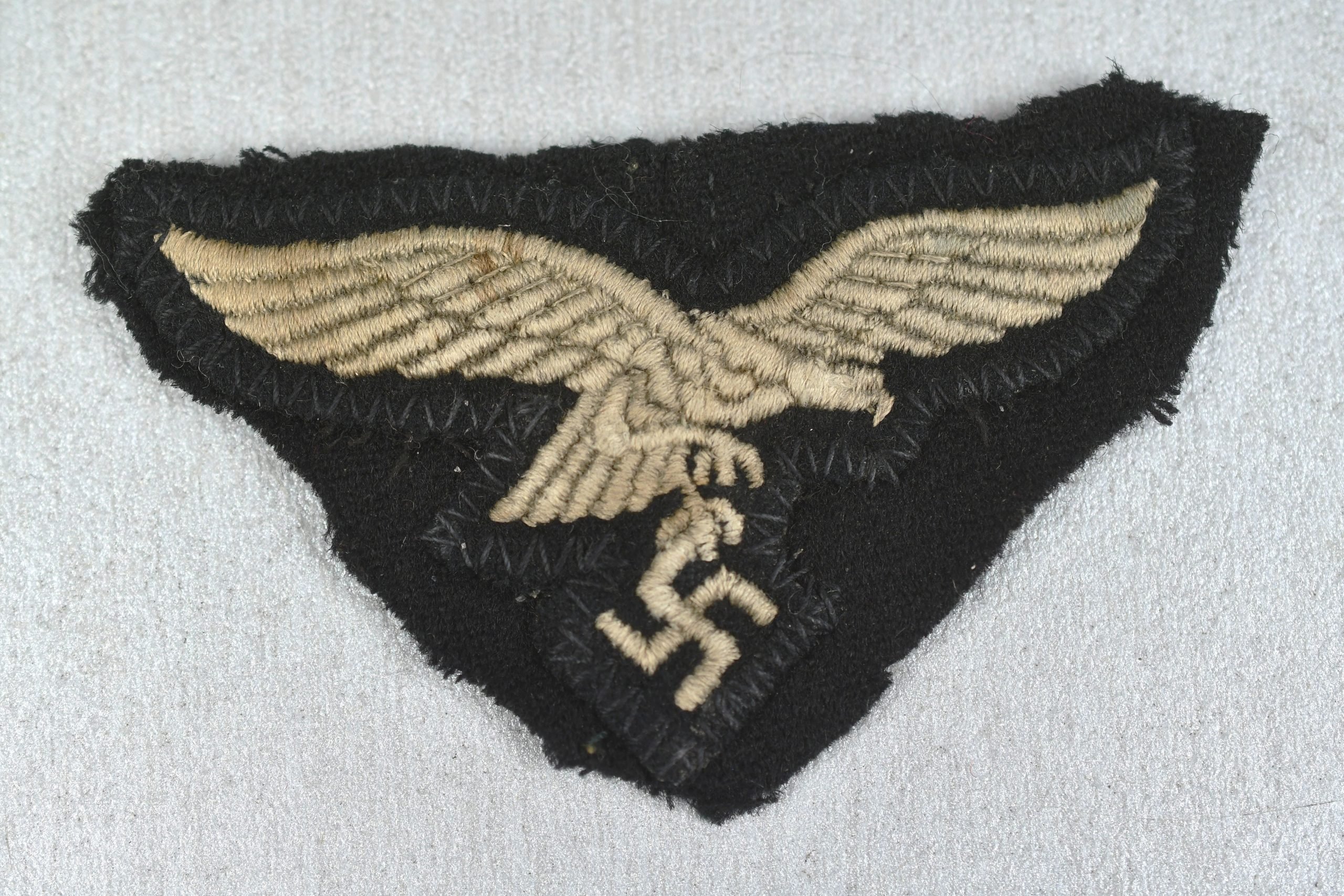 Rare original cut-off Luftwaffe cap eagle removed from a wartime M43 field cap of the Hermann Göring Panzer Division. These pieces were commonly taken as souvenirs by Allied soldiers, particularly American veterans, who often cut insignia directly from captured German uniforms and headgear to bring home after the war. Today these 'cut-off' insignia have become a well-established and highly collectible category within militaria collecting, as they represent authentic wartime souvenirs rather than post-war removed badges. The eagle remains attached to the original section of black cap cloth from the M43 field cap, clearly showing the typical factory zig-zag stitching used to attach the insignia to the headgear. The soft, thin black wool fabric is characteristic of Luftwaffe M43 caps. On the reverse the stitching pattern is clearly visible, and an interesting construction detail of the cap itself remains present: part of the seam where two sections of the cap were originally joined is still visible and stitched with the same thread. This is exactly what one would expect from a factory-applied insignia, as the insignia was sewn on using the same thread during production. This example comes from a long-established private collection specializing in cut-off insignia, assembled over many years by a dedicated collector. The collection was recently acquired and several pieces from it are being offered on our website, with this example being one of the highlights. Cut-off Luftwaffe cap insignia from the Hermann Göring formation are considerably scarcer than standard Heer examples and are highly sought after by collectors due to their clear battlefield souvenir character and undeniable authenticity.