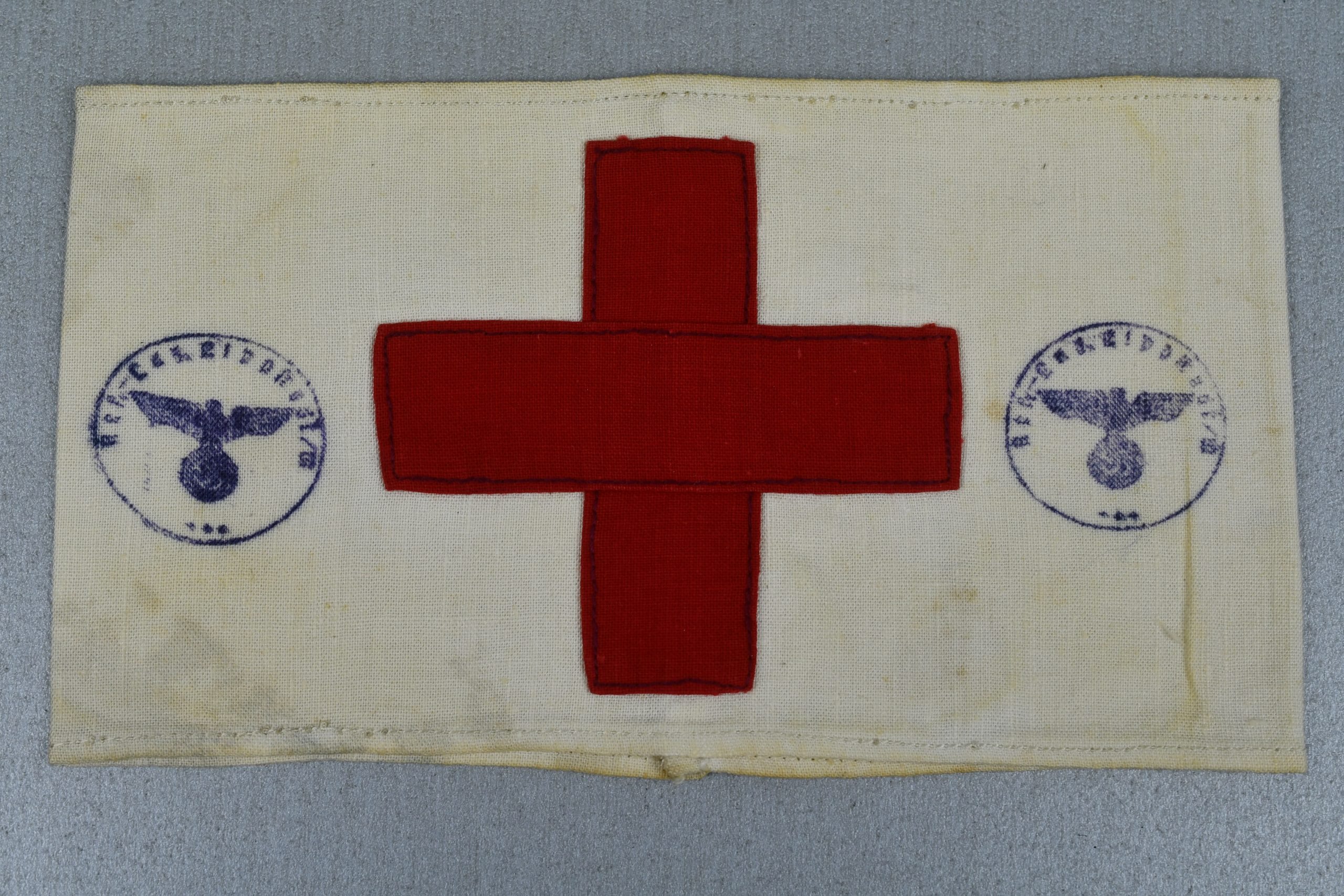 Wehrmacht Red Cross armband. Linen contruction with machine applied multi piece red cross. Shows two acceptance stamps from a Reserve Lazaret, can't figure out the name of it.
