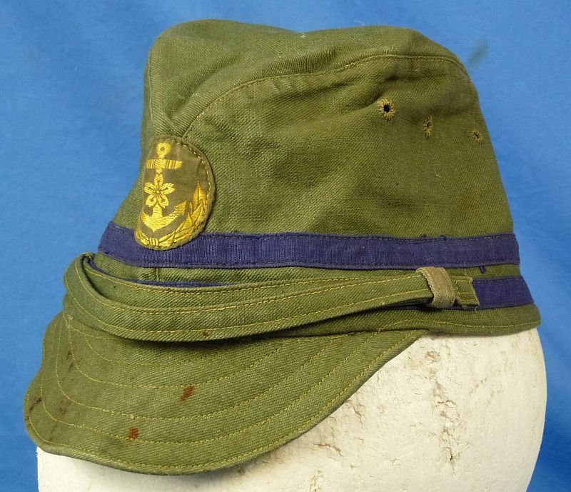 The body of the green cotton cap exhibits spots, primarily to the front visor, but the cap is without holes, damage or repairs. The interior sweatband has a bit of perspiration staining. The interior crown shows the Imperial Navy issue stamp. Overall very good condition.