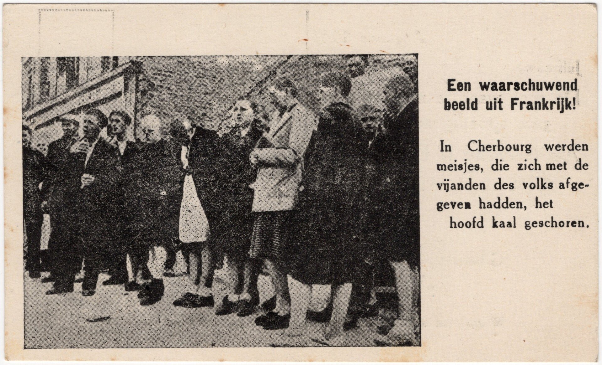 Original WW2 Dutch Resistance Postcard - Een waarschuwend beeld uit Frankrijk! Vrij Nederland (1944)Threatening message to women who had contact with German soldiers, showing shaven women in France, Cherbourg.Origineel Wo2 Nederlandse Verzets Postkaart - CEen waarschuwend beeld uit Frankrijk! Vrij Nederland (1944)Dreigende boodschap aan vrouwen die contact hadden gehad met Duitse soldaten, met afbeeldingen van geschoren vrouwen in Cherbourg, Frankrijk.