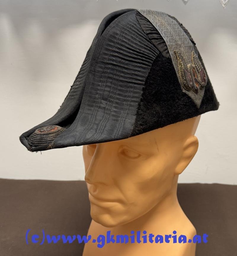 Zweispitz Beamter der k.u.k. Staatsbahnen - Stulphut!! - zur Galauniform eines Beamten der k. k. Staatsbahnen nach der Verordnung des Handelsministerium 1885 bzw. des Eisenbahnministeriums 1896 - Fertigung wohl um 1910 - Uniformclasse 6-8 - aus schwarzem, hochflorigem Seidenfilz - leichte Tragespuren - sehr formstabil - Krempe mit schwarzem , gewässertem Seidenband eingefasst - in den Hutspitzen jeweils eine goldgestickte Rosette mit dem Doppeladler auf orangerotem Grund - diese mäßig angelaufen - Hutschlinge aus gedunkelter goldener Eisenbahnborte mit dem 'Rad-Design' - unterlegt mit einer runden Kokarde aus gewässertem Seidenband, in der Spitze ein gesticktes Flügelrad - weißes, elegant plissiertes Seidenfutter (etwas fleckig) - darauf der goldgedruckte Herstellerverweis 'k. u. k. Hoflieferant M. Wolf, Wien VI', hellbraunes Schweißleder, kein Größenetikett -Kinnriemenlasche, Kinnriemen fehlt - sehr guter bis guter Zustand!