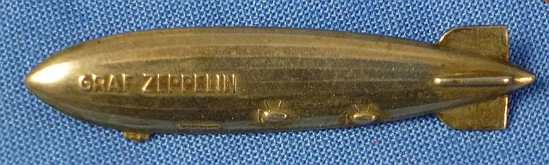 Approximately 1-3/4 inches long. The tail of the zeppelin bears swastikas. Very good condition.