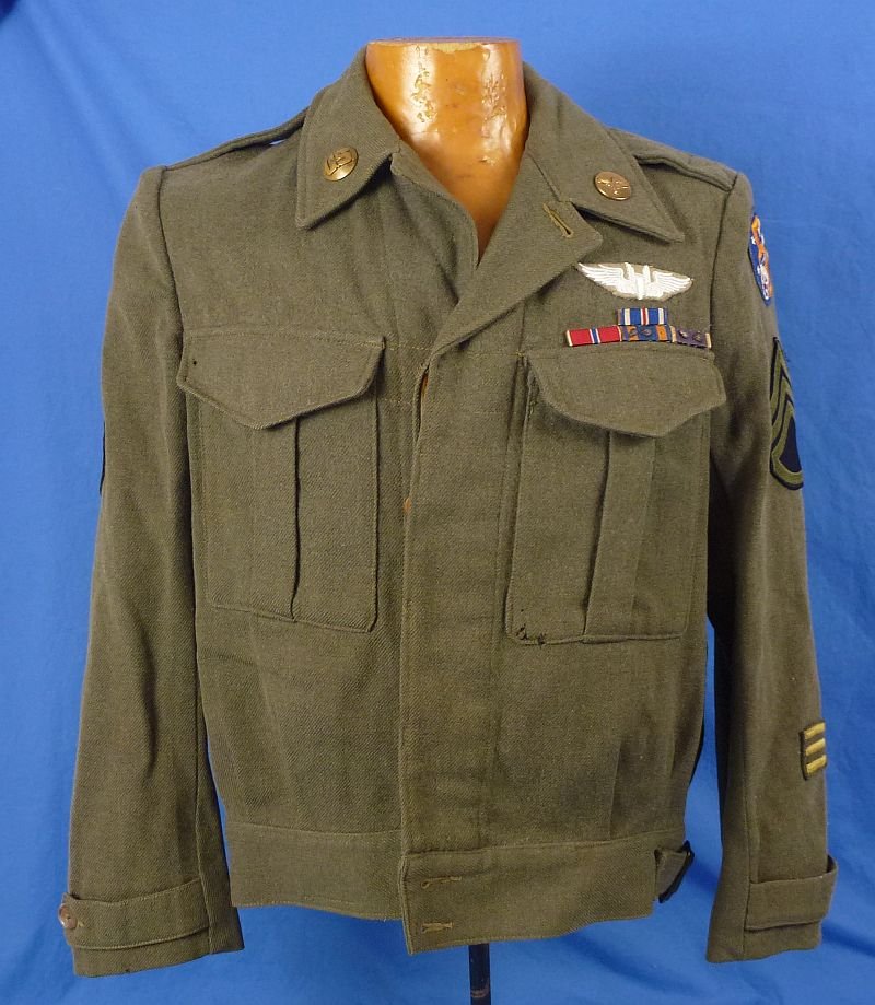 The wool Ike jacket was manufactured in Australia and it is tagged as a size 36 Regular. The jacket displays the rank chevrons of a Staff Sergeant; three overseas service chevrons; and an embroidered Aerial Gunner wing on the upper left side of the jacket. Below the wing are the individual ribbon bars of multiple decorations which are sewn directly to the jacket, to include the Distinguished Flying Cross; the Bronze Star; the Air Medal, with two oak leaf clusters ( a third cluster is missing) and the Purple Heart with two oak leaf clusters. The collar carries a domed 'U.S.' disk and a flat Army Air Force disk, both clutch back. The fully embroidered patch of the 5th Air Force is on the left shoulder. The rear of the jacket displays a large American flag that was directly embroidered onto the jacket. The jacket has a small hole at the bottom of the left front pocket, and it is lacking the two lowest closure buttons on the front, but overall the jacket is in very good condition.NO CODE
