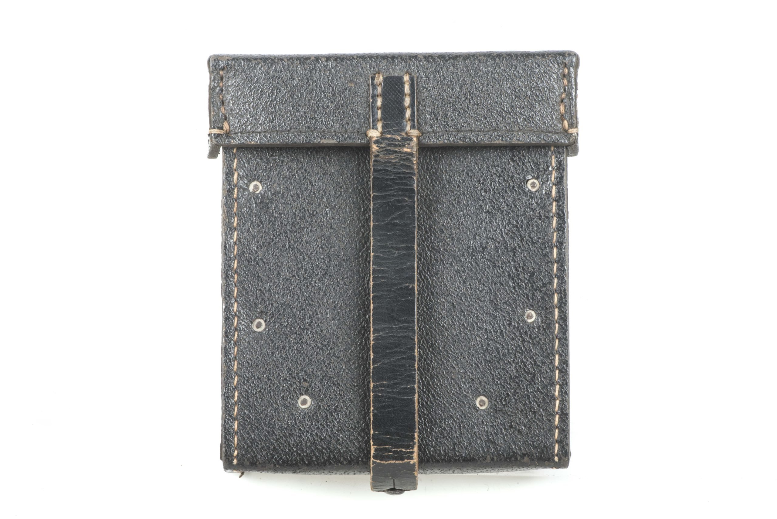 Textbook late war blackPressstoffMG42 tool pouch. The pouch is nicely markedgyb 44which indicates production byBauer, Wilhelm, Friedr., G.m.b.H., Lederwarenfabrik, Offenbach a.M.-Bieber.The pouch is in very good condition and complete with its original wooden and steel inserts. Excellent example!
