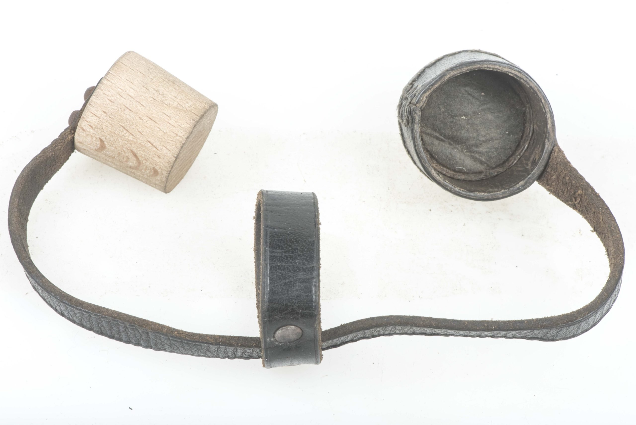 Beautiful and textbook ZF4 sniper scope lens cover. The lens cover is made out of a leather strap, wooden plug and apressstoffmade cap. The strap is in excellent condition without any serious damages or repairs, the leather is still flexible and the press stud is still functional. Almost impossible to find as a spare and this would be a nice addition to any ZF4 scope!