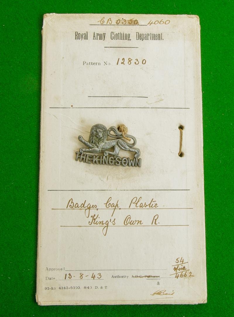 Scarce WW II plastic economy issue cap badge still affixed to a Royal Army Clothing Department pattern card. The card is dated 1943 with original wax seal to the reverse. The Lion of England above the voided title scroll, 'The King's Own'
