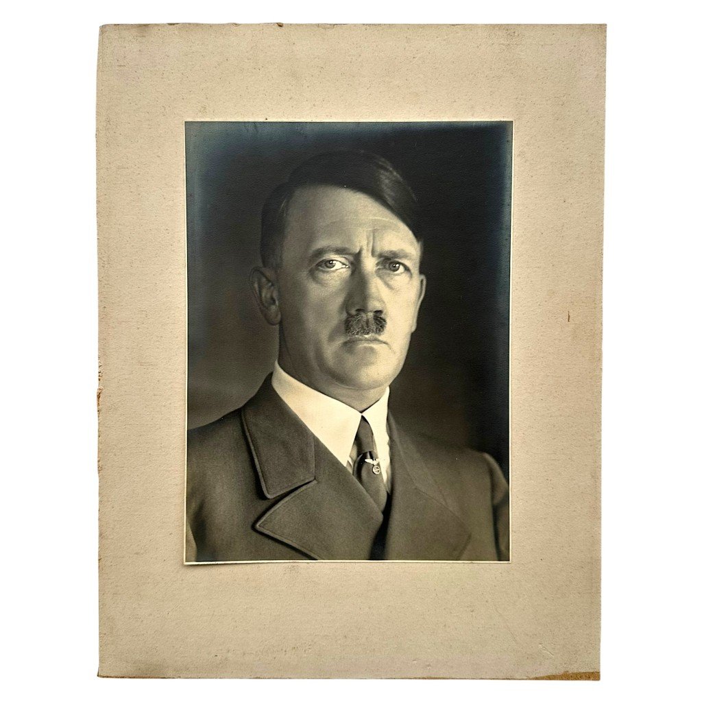 Original German portrait photograph from the Second World War period depicting Adolf Hitler in a formal studio portrait.This type of portrait was widely displayed in official buildings, offices, barracks and public institutions in Germany during the 1930s and 1940s.Such portraits formed part of the propaganda and visual culture of National Socialist Germany.The photograph is mounted on a cardboard backing as commonly seen with official distributed portrait prints from this period.The reverse shows visible mounting traces and signs of age consistent with period use.Size: 34 x 26.5 cm.An interesting collectible for collectors of historical photography and militaria from this period.Article number: 18587Originele WWII Duitse Adolf Hitler portretfotoOriginele Duitse portretfoto uit de periode van de Tweede Wereldoorlog met een formele afbeelding van Adolf Hitler.Dit type portret werd in de jaren dertig en veertig veel gebruikt in officiële gebouwen, kantoren, kazernes en publieke instellingen in Duitsland.De foto toont een klassiek studioportret in zwart-wit waarbij Hitler in formele kleding is afgebeeld.Dergelijke portretten maakten deel uit van de propaganda en visuele cultuur van nationaalsocialistisch Duitsland.Het exemplaar is gemonteerd op een kartonnen drager zoals gebruikelijk bij officiële of verspreide portretfoto's uit deze periode.Grootte: 34 x 26,5 cm.Interessant verzamelstuk voor verzamelaars van historische fotografie en militaria uit deze periode.