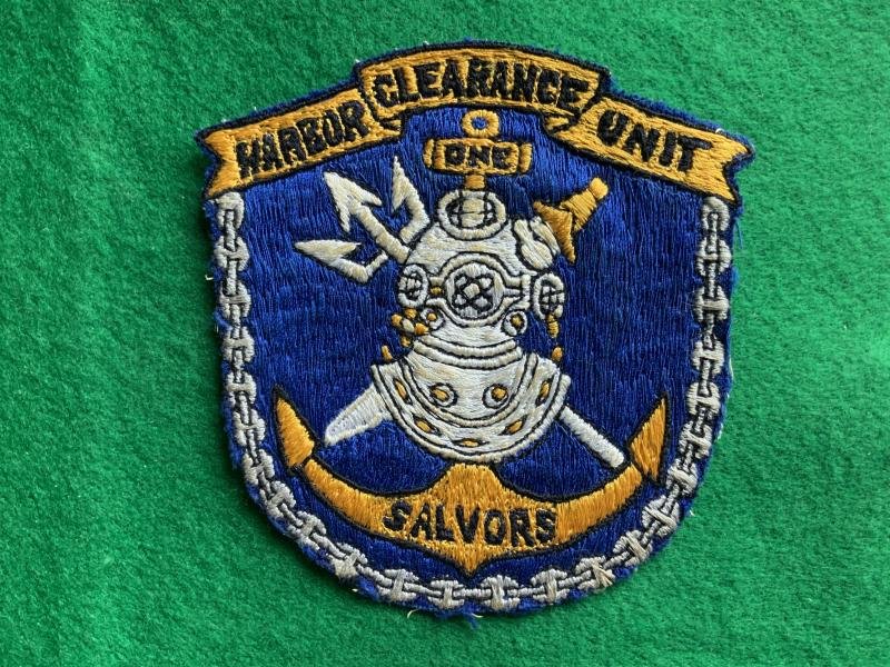 A locally made in-country machine made patch for Harbor Clearance Unit 1. Good colours fully embroidered example.Measures4 1/8' x 4 1/4' tallHarbor Clearance Unit One, a United States Navy unit, was commissioned in February 1966 with the mission '....to provide salvage repair; diving and rescue services in rivers and restricted waters and to conduct harbor and river clearance operations in the Western Pacific.' Some contended that the intended mission was to provide rapidly deployable diving and salvage teams in direct support of the Vietnam War. Whatever the actual intent was, the concept was proven so effective that the command was moved to continuous salvage service at Pearl Harbor, Hawaii, near the end of the Vietnam War.