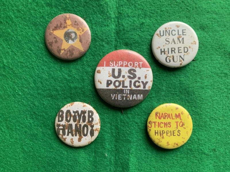 Anti-war Vietnam protest button badges, Set of 5 in used and aged condition. US troops would pin them onto the helmet covers.